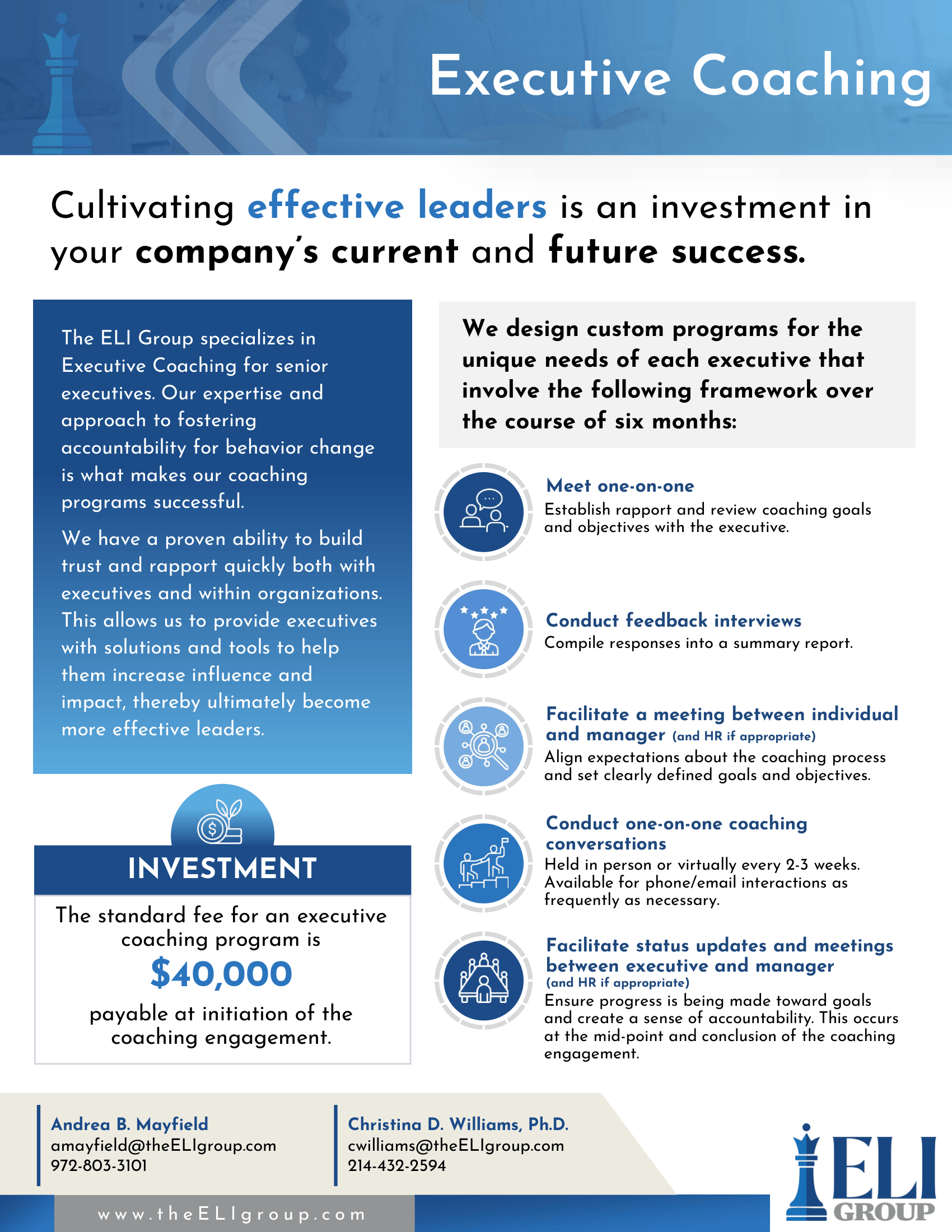 The ELI Group specializes in Executive Coaching for senior executives. Our expertise and approach to fostering accountability for behavior change is what makes our coaching programs successful.