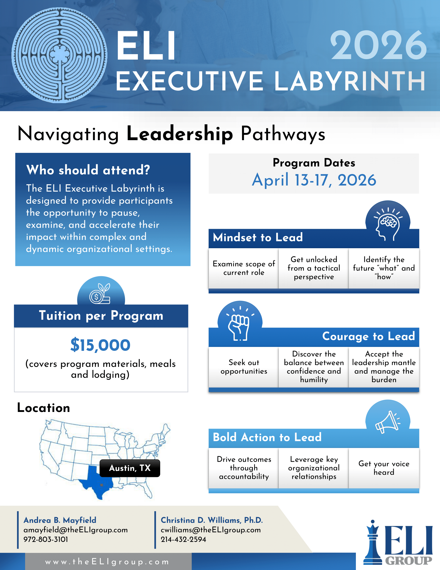 The ELI Executive Labyrinth is designed to provide participants the opportunity to pause, examine, and accelerate their impact within complex and dynamic organizational settings.